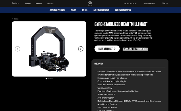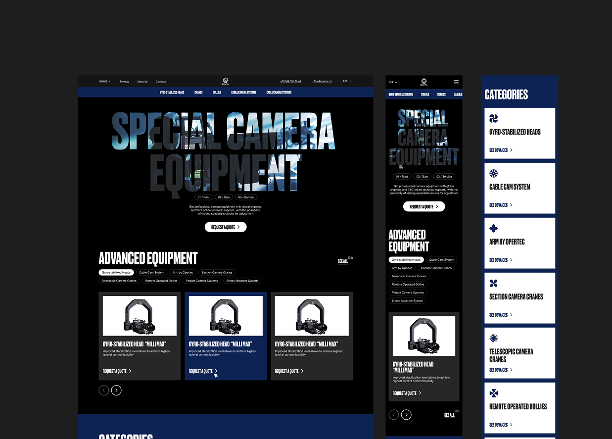 Для OperTec потрібно було створити зручний онлайн-каталог спеціалізованого відеообладнання для міжнародної аудиторії. Основна задача — зробити складний технічний асортимент зрозумілим, швидко знаходити потрібне обладнання та легко залишати запит на оренду, продаж або сервіс.